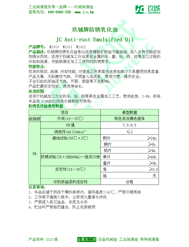 产品描述;玖城牌防锈乳化油是以深度精制矿物油为基础油,加入多种功能添加剂调合而成,适用于机械加工行业黑色金属的车、磨、钻、铣、拉等加工过程的冷却和润滑,并能够满足加工工序间的防锈要求。