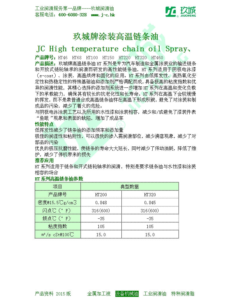 产品描述;玖城牌高温链条油HT系列是专为汽车制造和金属涂装业的输送链条和开放式链轮轴承的润滑而研发的高性能链条油,HT系列适用于阴极电泳漆(e-coat)、涂装、高温烘烤和固化的应用。HT系列由低挥发性、高热氧化安定性和热稳定性的特殊基础油和添加剂严格调配而成,具备极高的粘度指数和优异的润滑性能,其精心选择的添加剂系统进一步增加HT系列在高温和变化负载下的承载能力,确保其有较长的抗老化性和长寿命。HT系列在高温下会较缓慢的挥发,而不是象普通合成高温链条油样在高温下形成积碳,避免了对涂装和制成品的污染,减少了着火的危险。与阴极电泳涂装工艺以及所用的水性漆和涂装相容,减少和/或避免了漆装件表“鱼眼”现象和表面的缺陷,增加了成品率