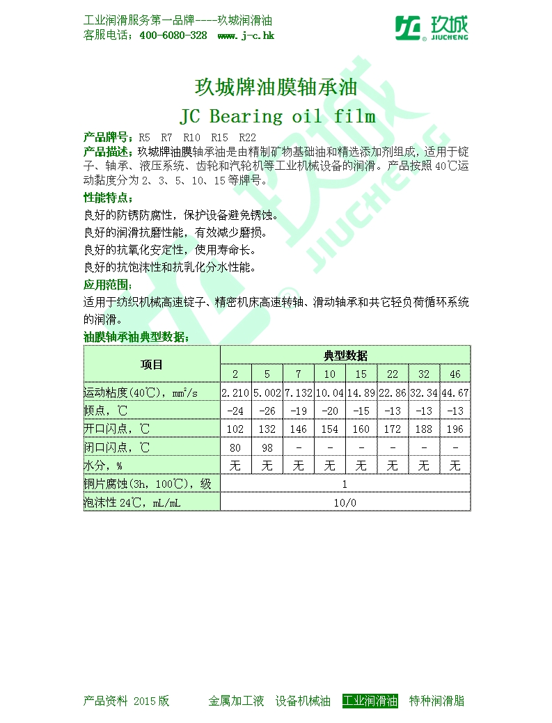 产品描述;玖城牌油膜轴承油是由精制矿物基础油和精选添加剂组成,适用于锭子、轴承、液压系统、齿轮和汽轮机等工业机械设备的润滑。产品按照40℃运动黏度分为2、3、5、10、15等牌号。