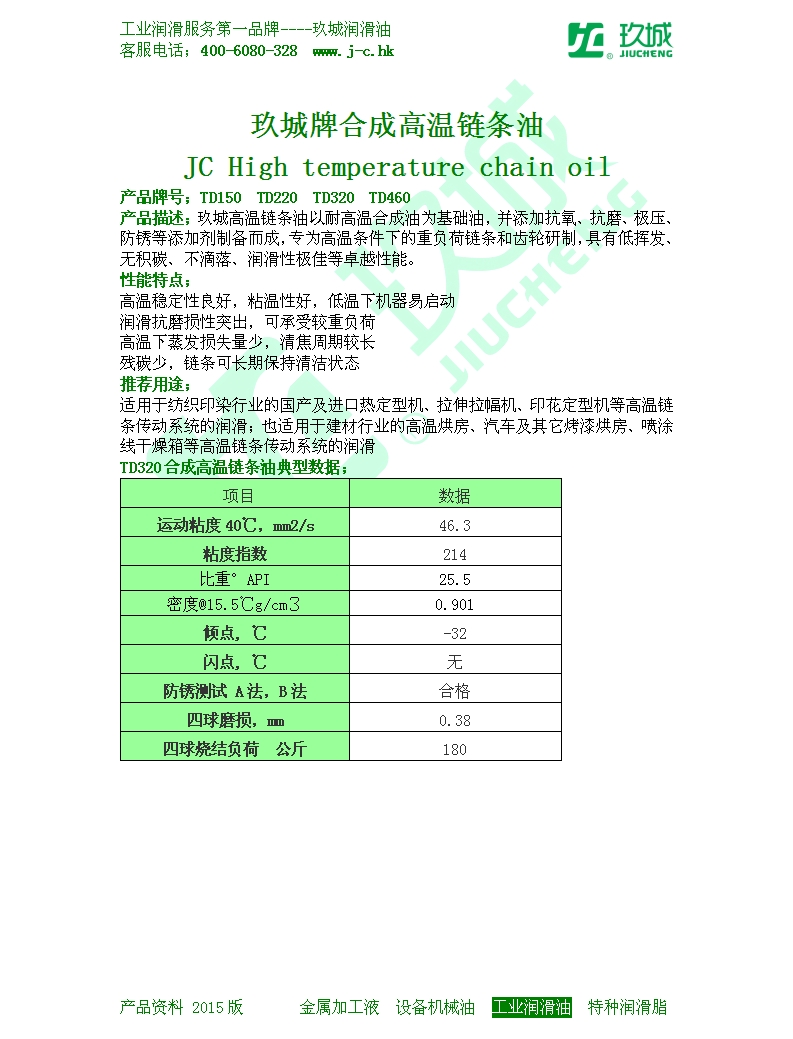 产品描述;玖城高温链条油以耐高温合成油为基础油,并添加抗氧、抗磨、极压、防锈等添加剂制备而成,专为高温条件下的重负荷链条和齿轮研制,具有低挥发、无积碳、不滴落、润滑性极佳等卓越性能。